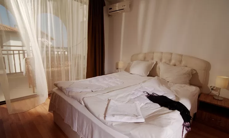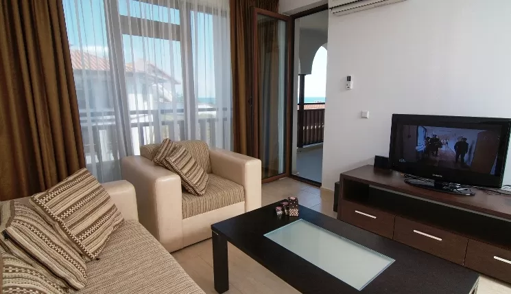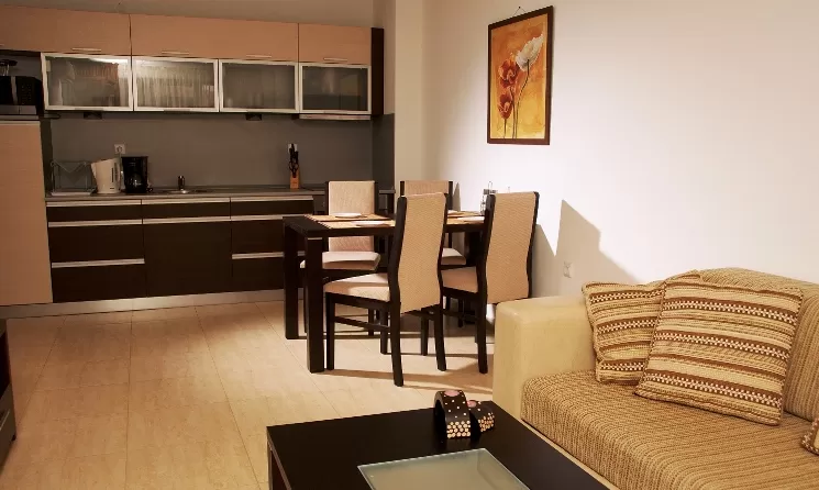 В апартаменте: гостиная и одна или две спальни, разделенные дверью • индивидуальный кондиционер • спутниковое TV • полностью оборудованный кухонный бокс • санузел с душем • балкон • пол – керамическая плитка • уборка номера – ежедневно • смена постельного белья – 2 раза в неделю • смена полотенец – 2 раза в неделю.
