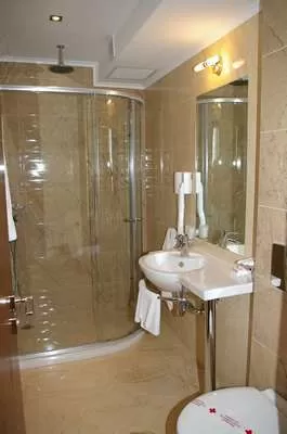 В ванной: душевая кабина • фен • телефон • полотенца.