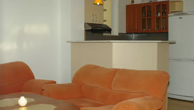 В апартаменте: гостиная и одна или две спальни, разделенные дверью • индивидуальный кондиционер • спутниковое TV • полностью оборудованный кухонный бокс • санузел с душем • балкон • пол – керамическая плитка • уборка номера – ежедневно • смена постельного белья – 2 раза в неделю • смена полотенец – 2 раза в неделю.