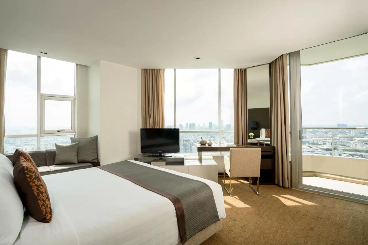 Панорамные окна от пола до потолка с видом на Бангкок, телевизор с плоским экраном, мини-бар, частные балконы.
