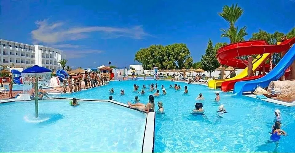 Открытый бассейн с пресной водой, детской зоной и водными горками.
