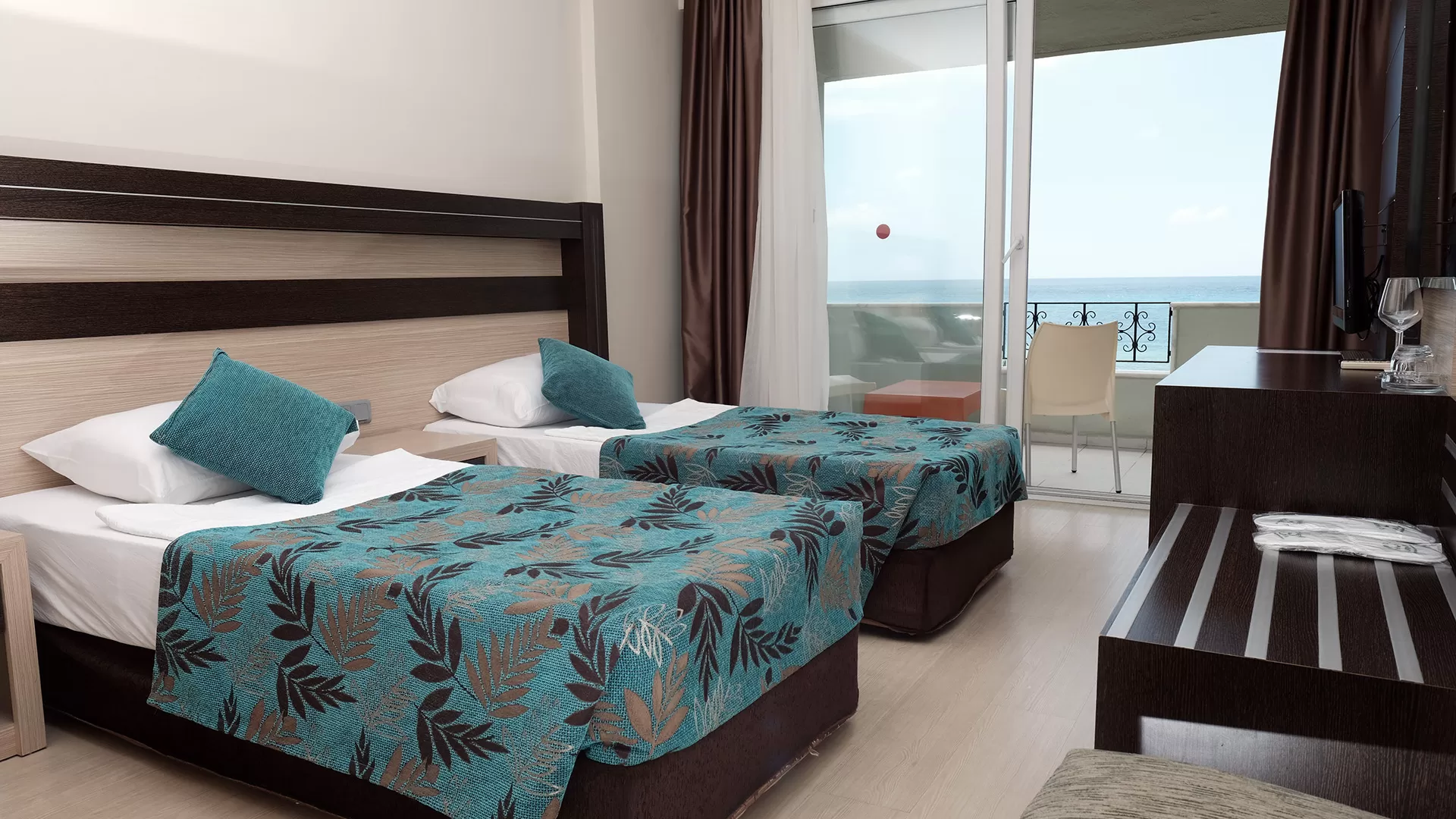 Фен в номере, кондиционер, пол –ламинат, балкон, уборка номера - ежедневно, ТВ - спутниковое (есть русский канал), телефон, душ, смена белья-2 раза в неделю, мини-бар (платно), сейф (платно). Номера с видом на море.