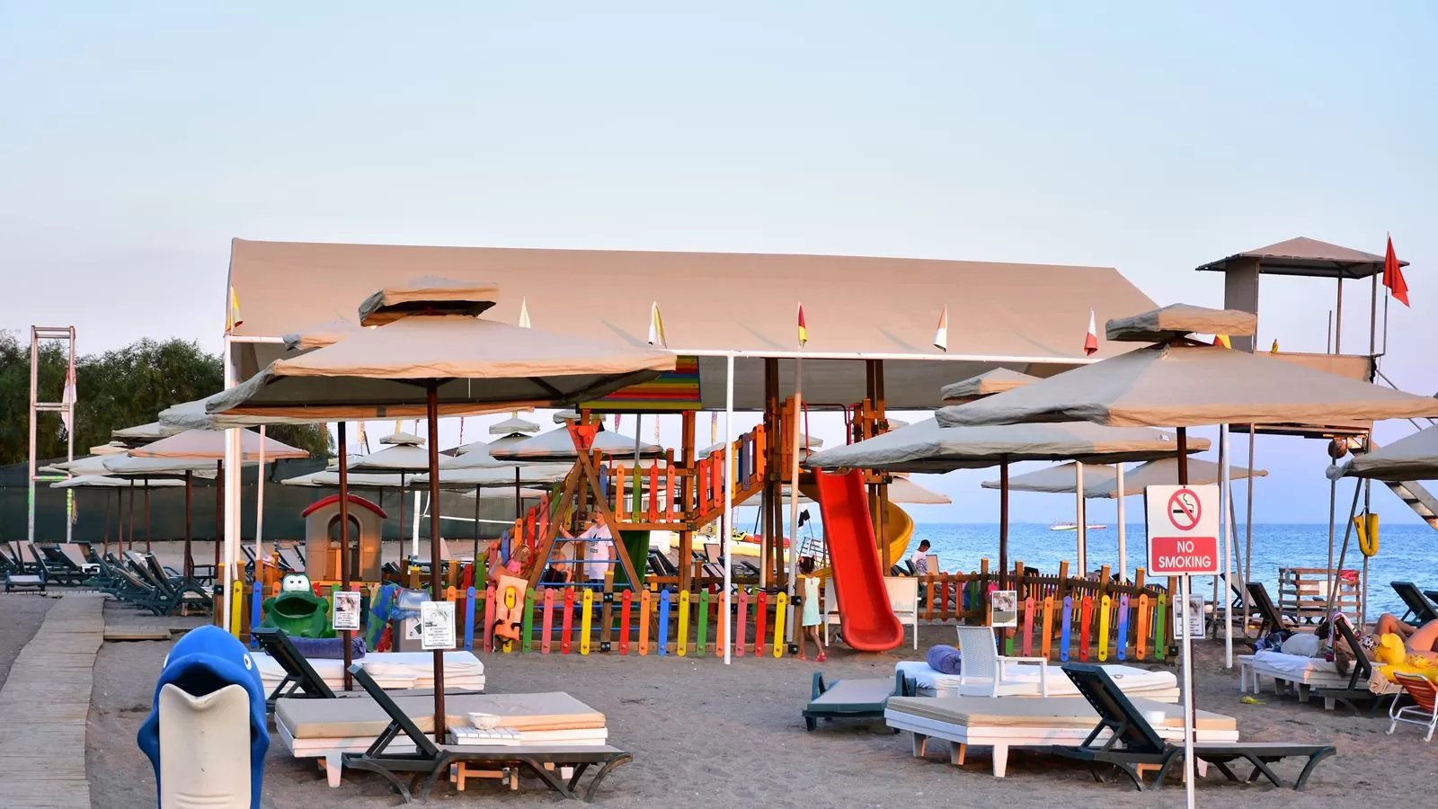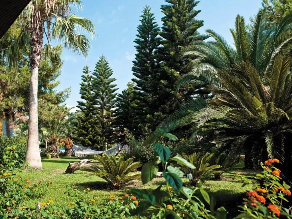 В отеле есть два больших бассейна с горками, собственный песчаный пляж и спа-удобства, включая турецкие бани. Территория отеля украшена зелеными садами.