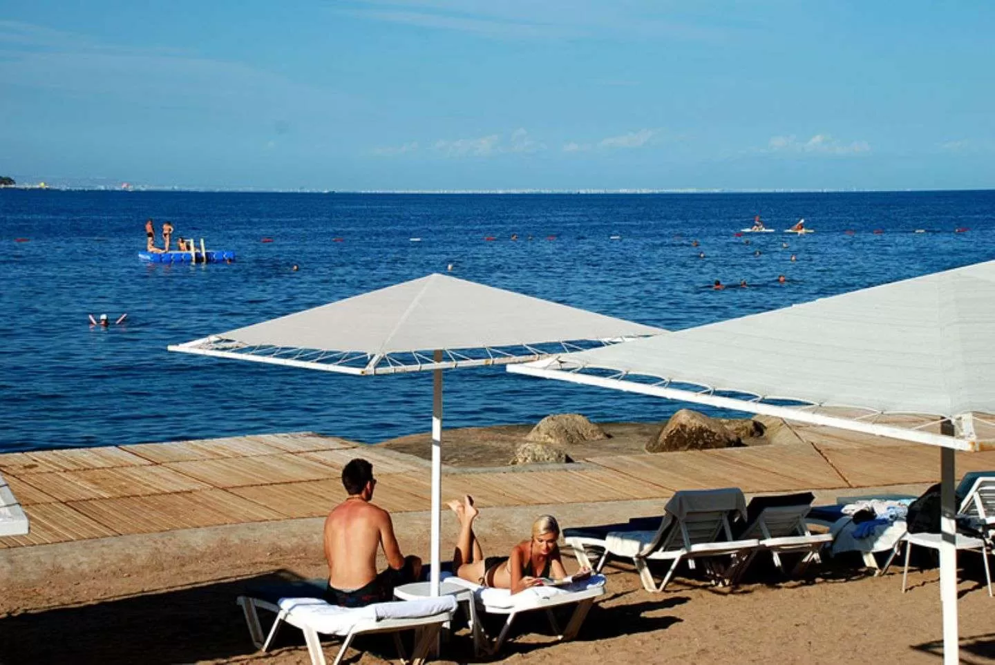 мелкая галька и песок, пляжу присвоен сертификат чистоты и качества «Blue Flag». Зонтики, шезлонги и полотенца – бесплатно.