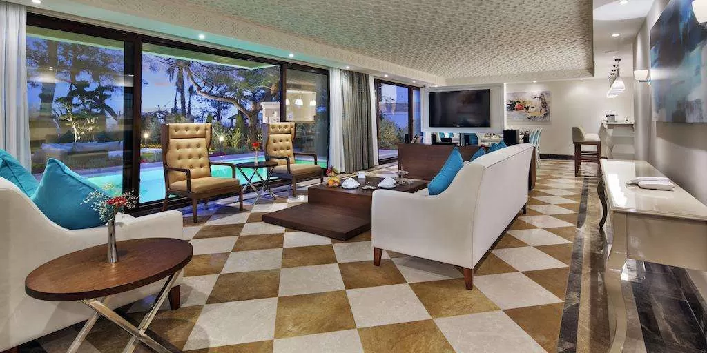2 трехкомнатных grand deluxe beаch front suites (индивидуальный бассейн, вид на море и на бассейн, гостинная, столовая, 2 спальни с дверью, 2 ванные, 2 терассы, 3 тв, макс. 5+1 чел., 129 м2)