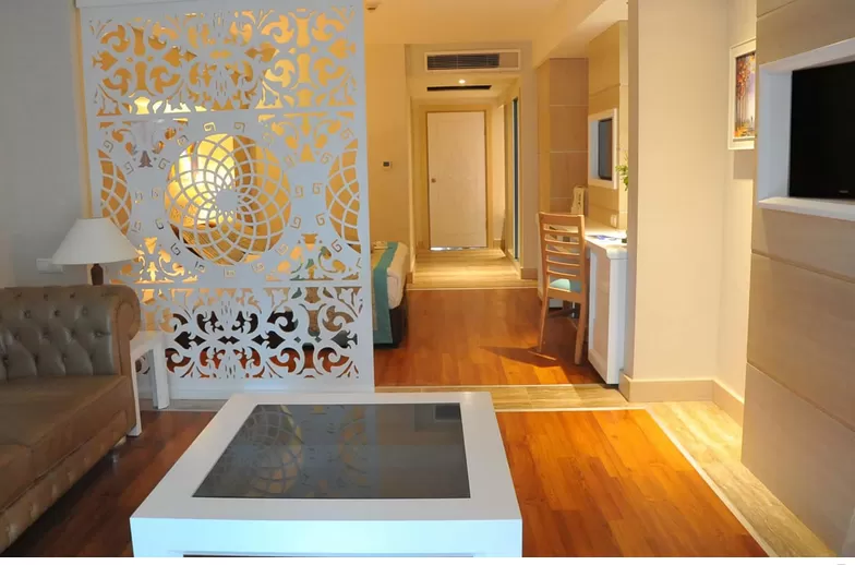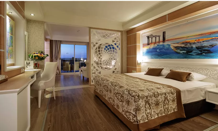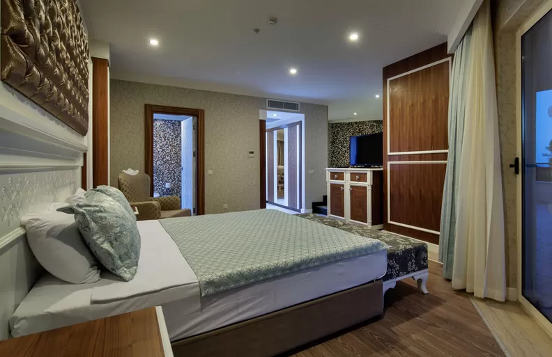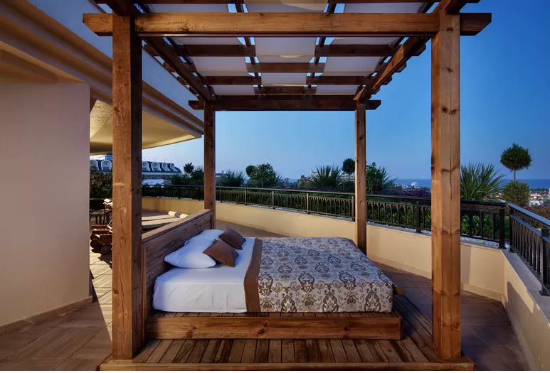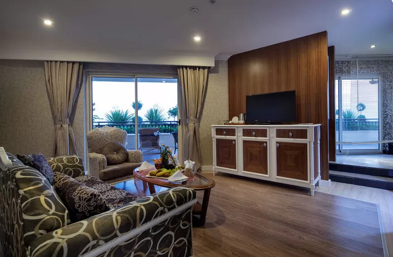 King Suites (61 м2): комнаты декорированы особым образом, с видом на море, спальня и гостиная с разделительной дверью, просторные балконы с шезлонгами, ванная комната с душевой кабиной, халат, оснащение стандартного номера.