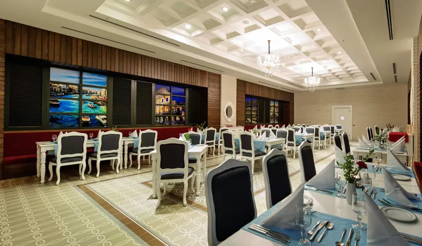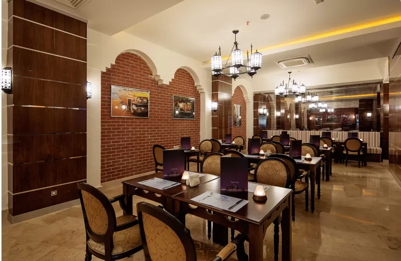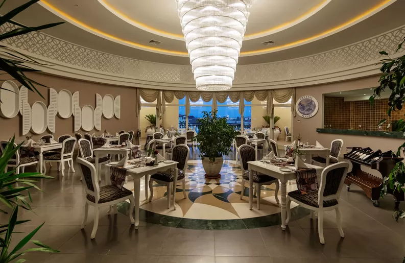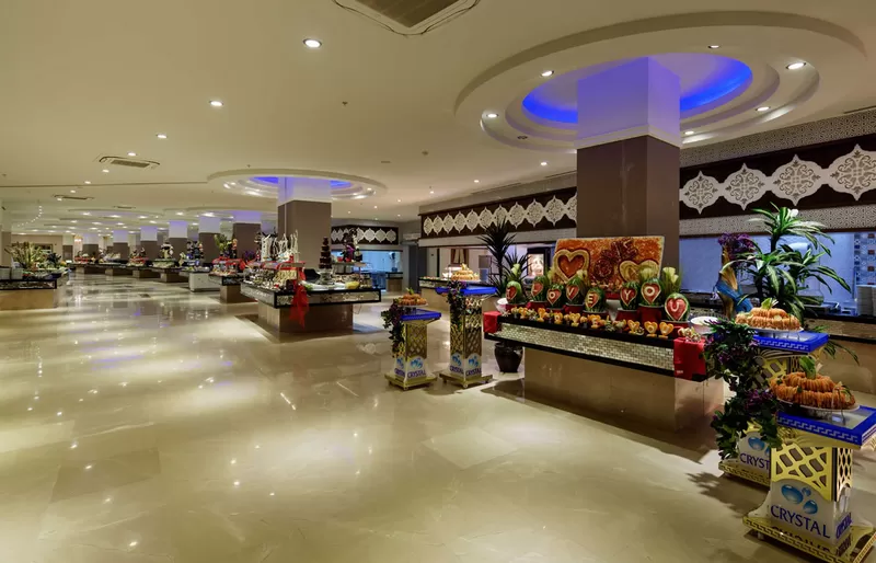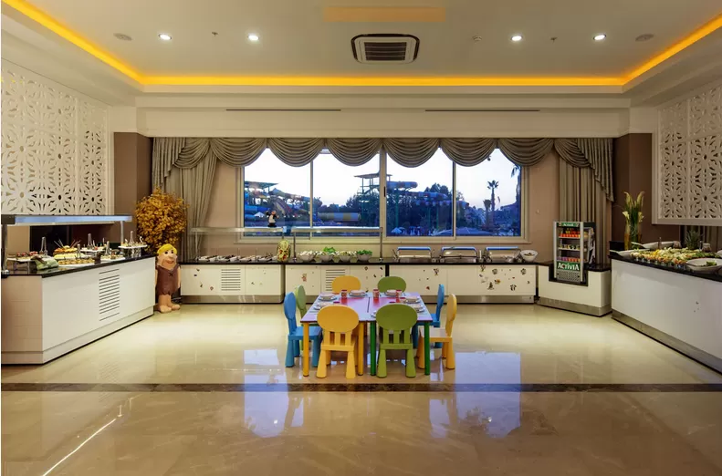 В ресторанах и барах: завтрак, поздний континентальный завтрак, обед и ужин - шведский стол, закуски в снэк-баре, детское меню, диетическое меню, чаепитие, кофе, выпечка, горячие и холодные закуски в течение дня, гёзлеме, свежевыжатый апельсиновый и морковный соки, сервис мороженого в определенные часы, ночные закуски, ужин в ресторанах A'la Carte – посещение 3 раза за период проживания, алкогольные и безалкогольные напитки местного производства 24 часа и некоторые импортного производства с 10:00 до 01:00 в часы работы баров, сервис в номер с 02:00-06:00.