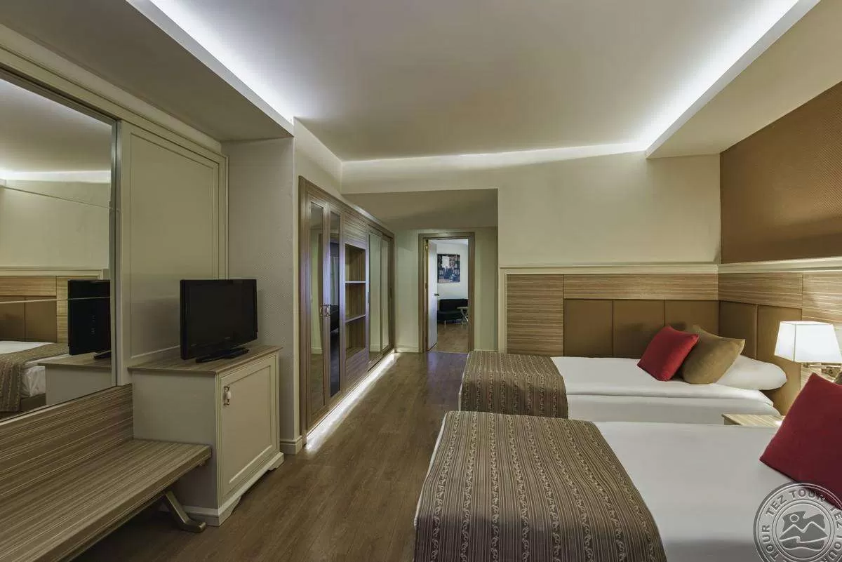Отель состоит из двух зданий (6 и 7 этажей), 416 Standard Room (из них 5 номеров для инвалидов (с душем), french bed, single bed, sofa bed, макс. 3+1 чел., 27 м2), 79 двухкомнатных Family room (2 спальни с дверью, балкон, макс. 4+1 чел., 43 м2). В номерах центральный кондиционер, спутниковое ТВ, мини-бар (прохладительные напитки, пиво, орешки, шоколад пополняется ежедневно / бесплатно), сейф (бесплатно), ванная комната с ванной или душевой кабиной, балкон, ламинат. Есть номера с видом на море.