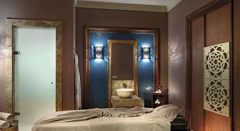 - 5 Villa Ela Palace (макс. 6 чел., внутренние помещения - 297 м2). На отдельной территории среди зелени находится 5 вилл ElaPalace. Двухэтажная вилла Ela Palace состоит из гостиной столовой, встроенной кухни, 3 спален, личного бассейна, турецкой бани, сауны и джакузи с выходом на террасу.Бесплатные услуги: Персональная встреча в аэропорту, трансфер на VIP транспорте Аэропорт Отель Аэропорт, ускоренная процедура регистрации в вилле, услуги дворецкого 24 часа в сутки, обслуживание номера 24 часа в сутки, резервации во всех ресторанах a la carte за исключением Японского ресторана Teppanyaki, услуги прачечной и химчистки, VIP Set-up, в день заезда: блюдо с фруктами и со сладостями, цветы; ежедневная газета, подготовка номера ко сну, ноутбук по запросу, beachsuit на пляже, Барбекью в саду виллы раз в неделю. Для гостей, проживающих в номерах высшей категории предоставляется мобильный телефон для связи с персоналом. Платные услуги: Организация вечеринки дня рождения на вилле, развлечения & организация праздников, VIP Вилла меню. Описание нижнего этажа: Гостиная и столовая, спальная, полностью оснащенная кухня, микроволновая печь, кофемашина, паркет и мрамор, туалет, индивидуальная система кондиционирования, мебель класса люкс в гостиной и столовой, система Домашний кинотеатр, холодильник, плита, духовка, спут. TV, радио-телефон. Описание спальни на нижнем этаже: 2 кровати высокого качества, мягкая мебель, ванная комната с ванной и туалетом, индивидуальная система кондиционирования, Спутн.TV, мини-бар, телефон, халат и тапочки, фен. Описание спальни на верхнем этаже: 2 кровати высокого качества, мягкая мебель, рабочий стол, ванная комната с ванной и туалетом, индивидуальная система кондиционирования, спут. TV, мини-бар, телефон, халат и тапочки, фен. Описание спальни для родителей на верхнем этаже: Двуспальная кровать высокого качества, мягкая мебель, гардеробная, индивидуальная система кондиционирования, спут. TV, мини-бар, телефон, халат и тапочки, фен, весы, косметическое зеркало, турецкая баня, сауна, душ, туалет, джакузи с выходом на террасу, место для загара на террасе, зонтики и шезлонги на террасе. Сад (550 -750 м²).Описание: 65 м2 подогреваемый бассейн, Oбеденный стол, садовая мебель, беседка, зонтики и шезлонги, гамак.