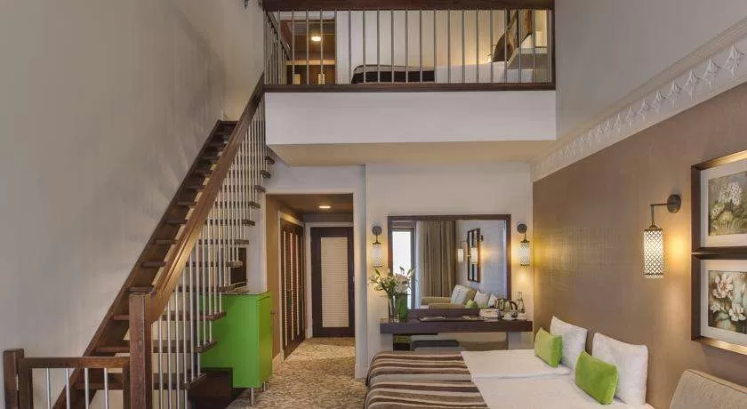 - 70 Family Duplex Room (макс. 4 чел, 65 - 75 м2). Вид на ландшафт/море, двухэтажный номер, 1 этаж: 2 односпальные кровати, ковровое покрытие, центральная система кондиционирования, мини-бар, спут.TV, телефон, туалет и ванная комната с ванной, халат и тапочки, фен, косметическое зеркало, балкон; 2 этаж: двуспальная кровать, ковровое покрытие, центральная система кондиционирования, сейф,спут.TV, телефон, туалет и ванная комната с ванной, халат и тапочки, фен, косметическое зеркало. Во всех номерах ковровое покрытие и балкон. В номерах категории Family Duplex Room нет дверей между этажами. На лестнице присутствует калитка для безопасности детей.