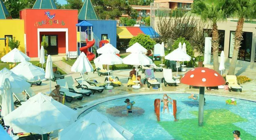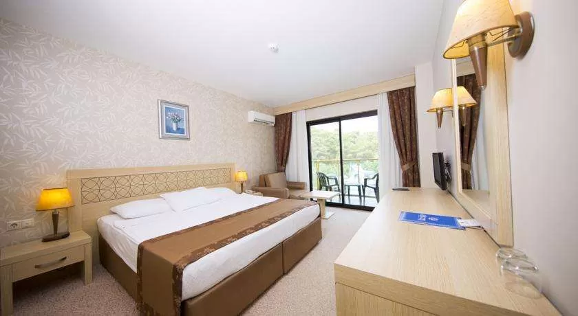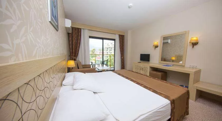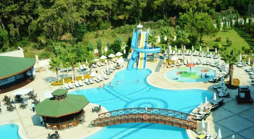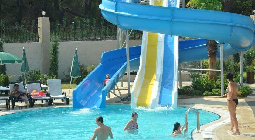 В 45 км от аэропорта г. Анталья, в 9 км от Кемера, в поселке Гёйнюк, в 400 м через дорогу от собственного пляжа.