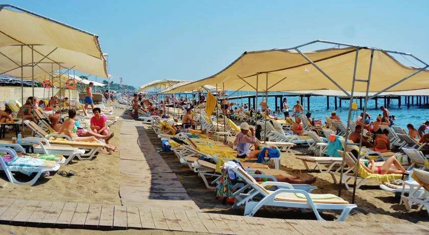 Песчаный пляж, лежаки, шезлонги, зонтики.