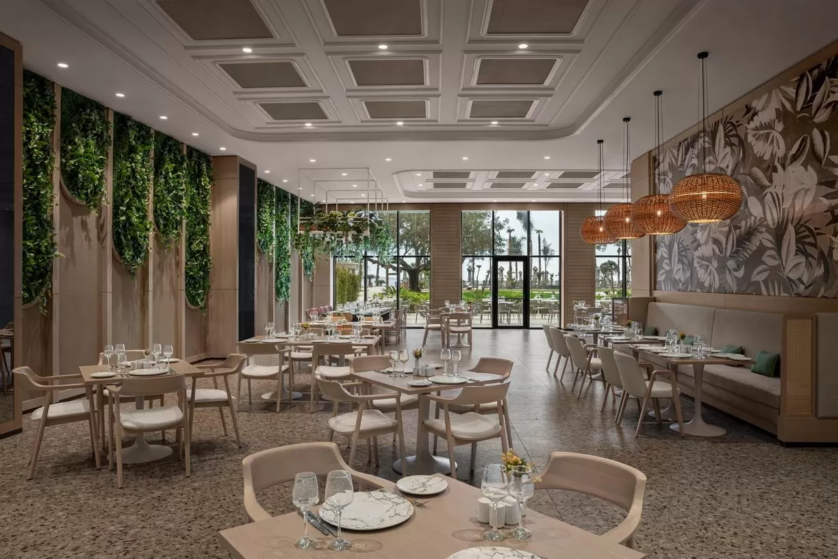 Отель работает по системе Ultra All Inclusive (UAI), которая включает трехразовое питание по системе "шведский стол" в главном ресторане отеля, а также местные и импортные алкогольные и безалкогольные напитки, мороженое и закуски в течение дня. На территории отеля находятся главный ресторан с интернациональной кухней, шесть ресторанов с обслуживанием по меню (турецкая, средиземноморская, морепродукты, стейки), 11 баров, кондитерская и пляжный снэк-ресторан.Для маленьких гостей предусмотрены детская кроватка в номер по запросу, детский клуб, игровая комната, детский бассейн, уголок для приготовления детского питания, стульчики для кормления и детское меню в главном ресторане. Также доступны спальная комната, комната для кормления, детская коляска, радионяня, детская ванночка, горшок, детский набор для ванн и ночник по запросу.