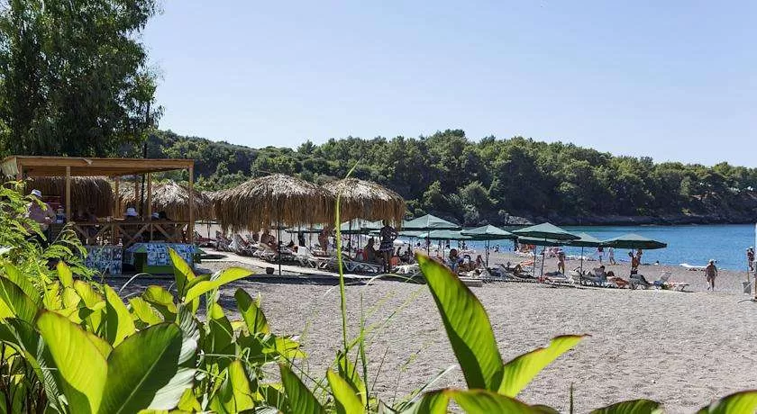 Собственный песчано-галечный в 200 м; шезлонги, зонтики, матрасы бесплатно.
