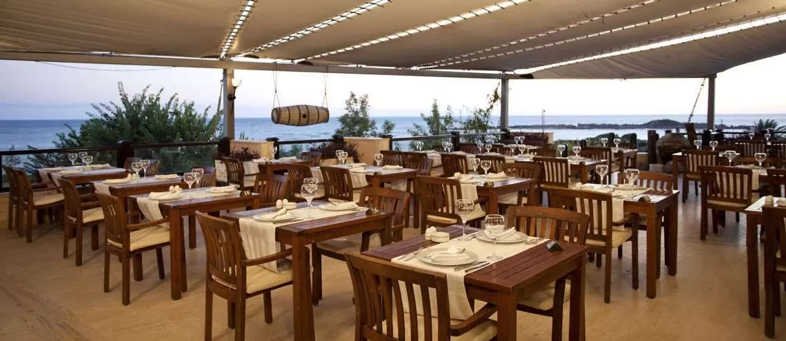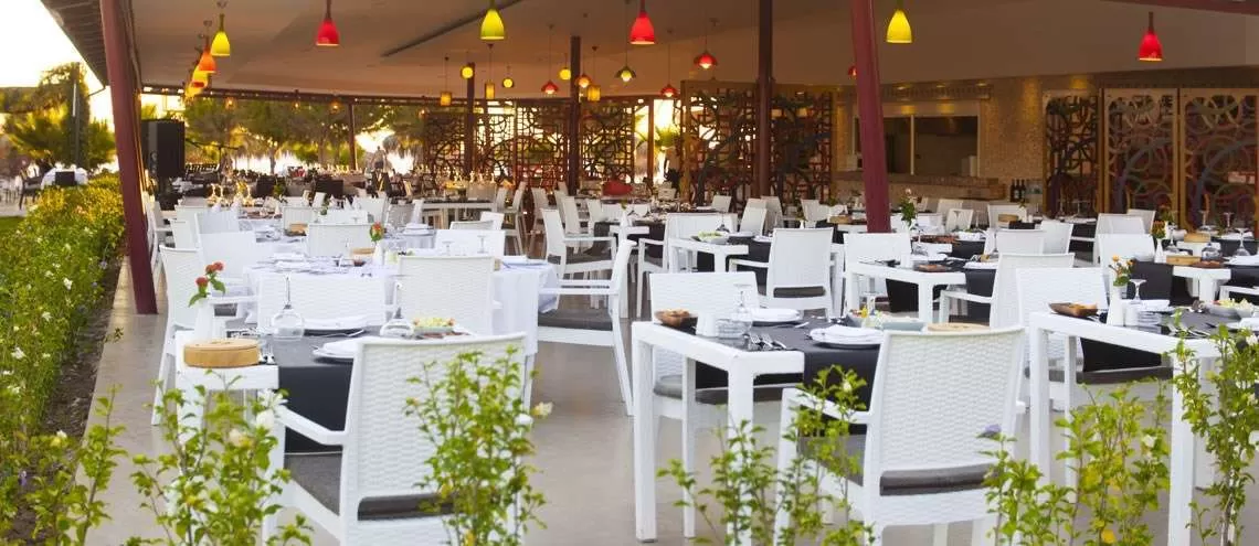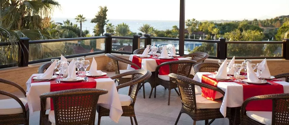В ресторанах и барах: главный ресторан рассчитан на 800 человек (крытый, с кондиционером - 350 мест, летняя терраса рассчитана на 450 мест, детские стулья): завтрак, поздний завтрак, обед, ужин, поздний ужин - шведский стол, горячие и холодные закуски в течение дня, чаепитие, кофе и выпечка, турецкие лепешки и пицца, мороженое в определенные дни, ночной суп, услуги ресторанов A’la carte по предварительной резервации – 1 посещение ( 6 A la Carte ресторанов: Yakamoz: рыбный ресторан; Ottoman - турецкий ресторан; Venetzia - итальянский ресторан; Ja-chi - китайский ресторан; Mexika - мексиканский ресторан; Yunan - греческий ресторан. Часы работы ресторанов с 19:00-21:30 (в течении 7 дней проживания в отеле посещение 2 ресторанов бесплатно по предварительной записи, 10 дней - 3 ресторана, 14 дней - 4 ресторана), c 10:00 до 24:00 алкогольные и безалкогольные напитки местного и некоторые импортного производства на разлив, напитки на дискотеке c 23:00 до 01:30; 4 бара: лобби-бар, бар у бассейна, бар на пляже, диско-бар; кондитерская Bon Bon.