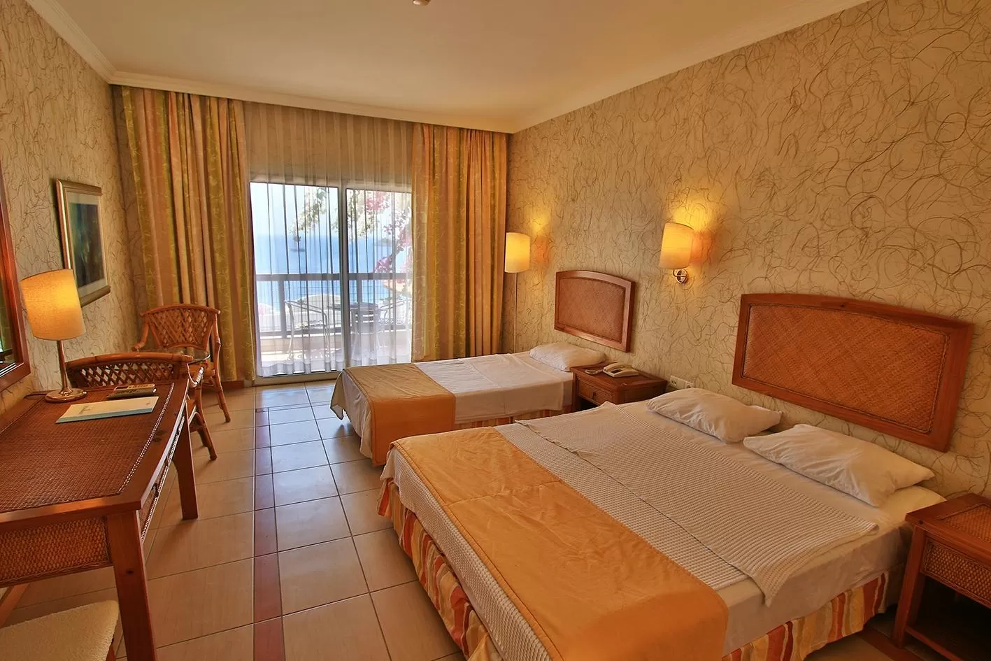 Фен в номере, инд. кондиционер, пол –керамическая плитка, балкон или терраса, уборка номера - ежедневно, ТВ - спутниковое (есть русский канал), телефон, душ, сейф (платно), мини-бар (вода – бесплатно, при заезде), смена белья-3 раза в неделю.