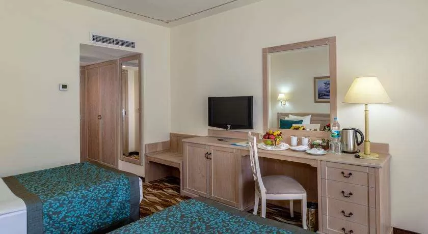 - 307 стандартных комнат с прямым видом на море, с боковым видом на мореи с видом на сад (26 кв.м) 4 комнаты для инвалидов, ванна, фен, телефон, сейф (бесплатно), мини-бар, ТВ с российским каналом, балкон, ковровое покрытие, центральное кондиционирование, детская кровать (по запросу). Смена белья в неделю 3 раза, смена полотенец ежедневно.