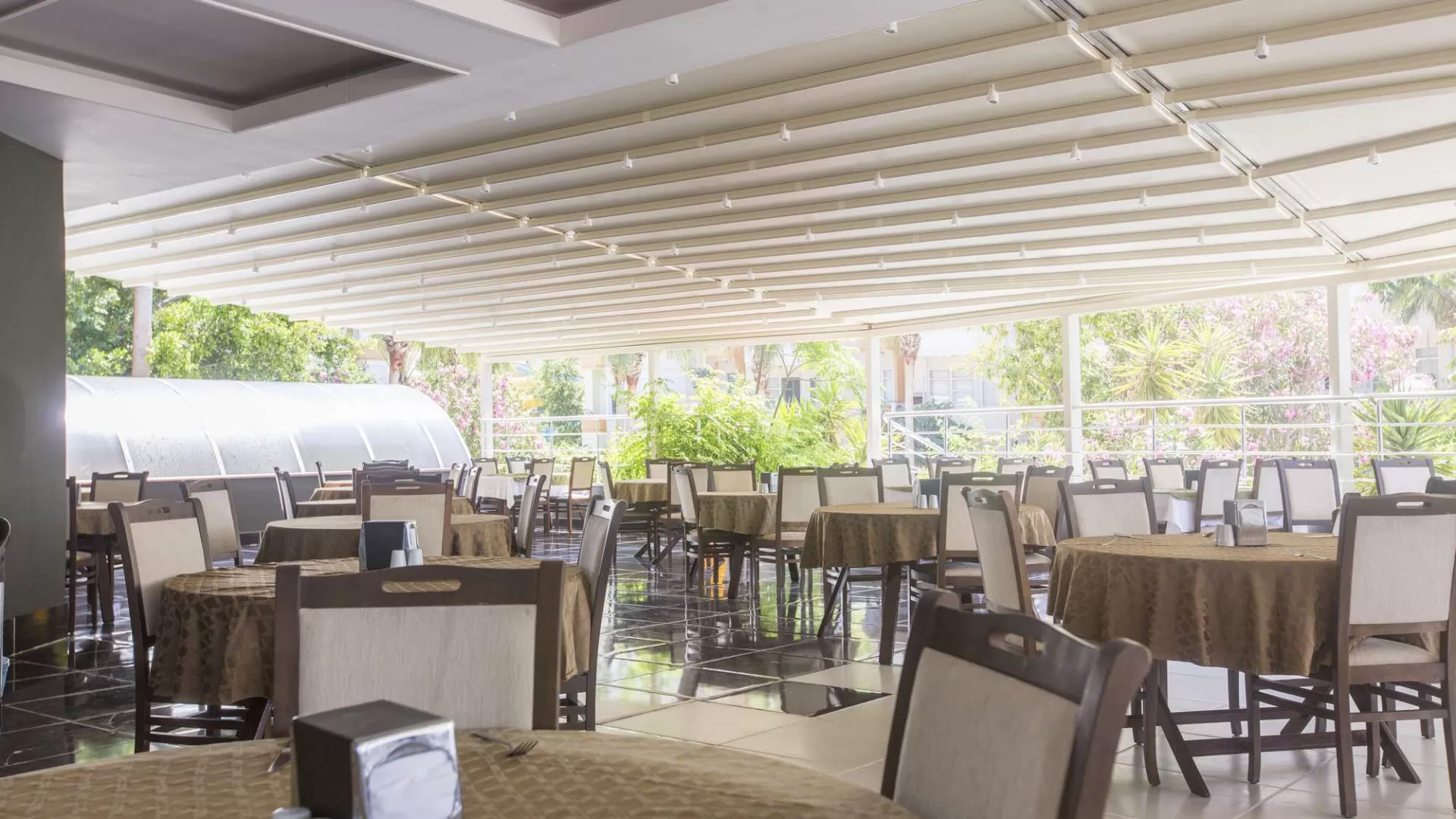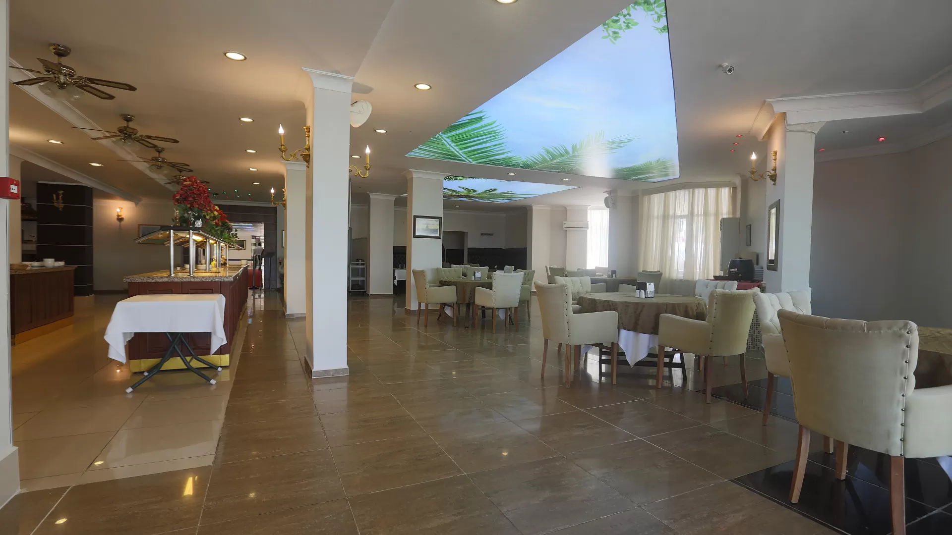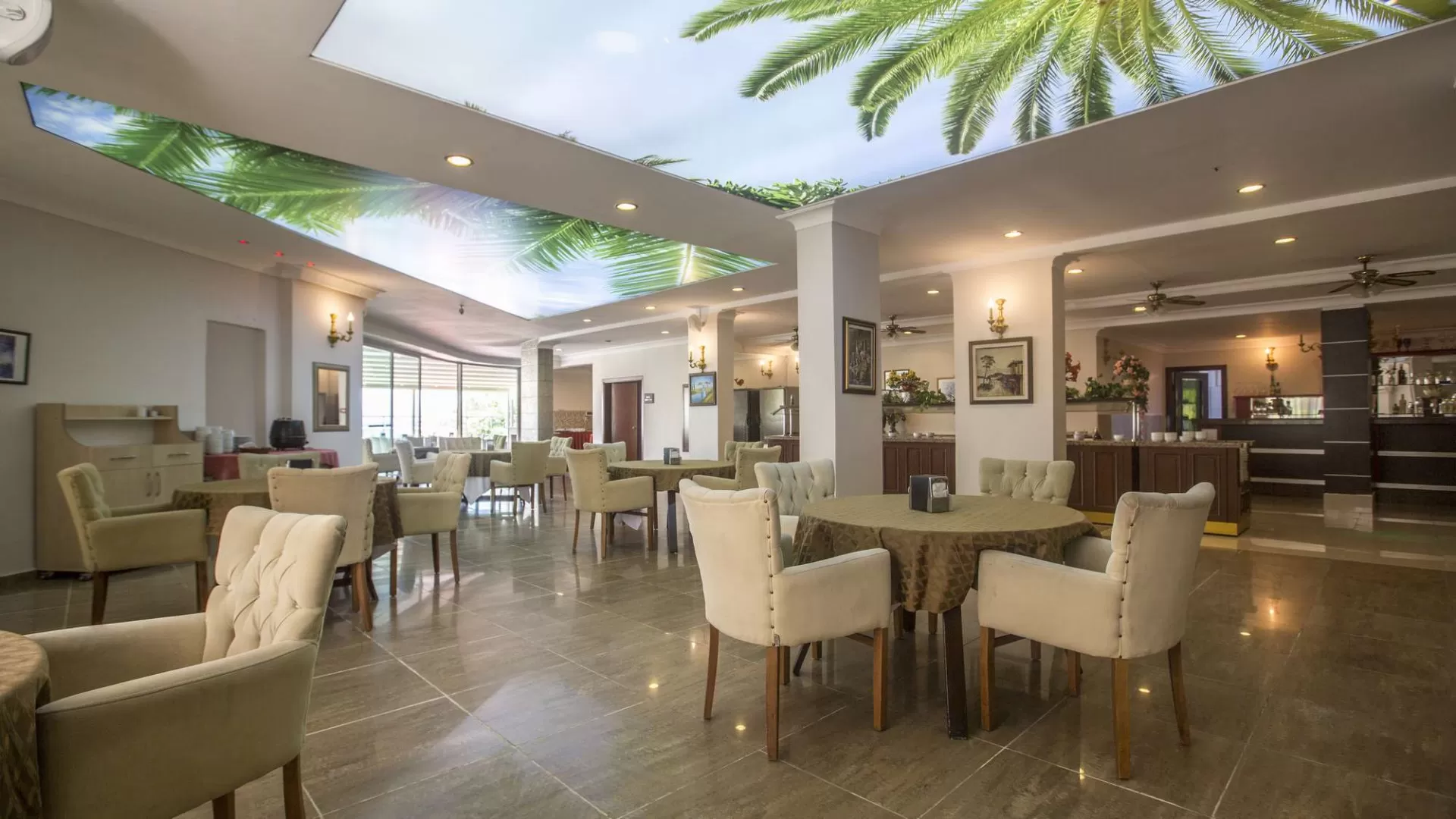 В отеле работает лобби-бар (круглосуточно) с безалкогольными напитками, бар у бассейна (10:00-23:00). Основной ресторан предлагает завтрак "шведский стол" с 07:30 до 09:30, поздний завтрак с 09:30 до 10:00, обед с 12:30 до 14:00, закуски (в снэк баре) с 14:00 до 16:00, ужин с 19:00 до 21:00 и поздний ужин с 23:00 до 24:00. Система "Все включено" действует с 10:00 до 23:00 и включает безалкогольные и алкогольные напитки местного производства.