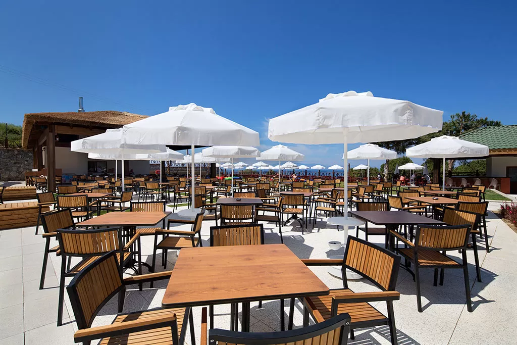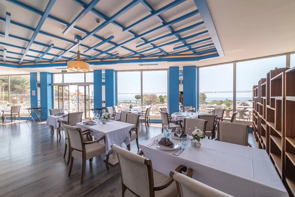 В ресторанах отеля предлагаются итальянская, турецкая и рыбная кухни. Часы работы ресторанов с 19:00 до 22:00, необходима предварительная резервация. Возможна одна бесплатная посещение одного из ресторанов при проживании не менее 4 ночей. Лобби-бар работает круглосуточно, бар на пляже - с 10:00 до 17:00, London Bar - с 10:00 до 00:00, Relax Bar - с 10:00 до 23:00, диско-бар - с 23:00 до 00:30. Основной ресторан предлагает завтрак с 07:00 до 10:00, поздний завтрак с 10:00 до 11:00, обед с 12:30 до 14:00, закуски (в снэк-баре) с 12:30 до 16:00, ужин с 18:30 до 21:00 и поздний ужин с 23:00 до 00:00. Система "Все включено" действует с 07:00 до 00:00 и включает напитки местного производства. За дополнительную плату доступны импортные напитки и напитки в бутылках.