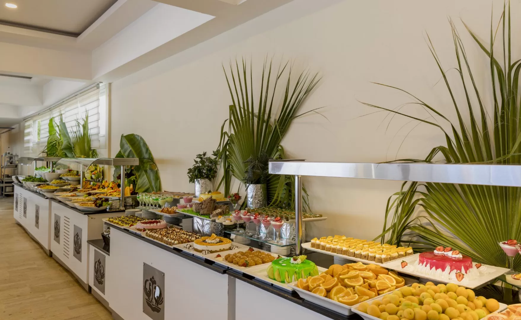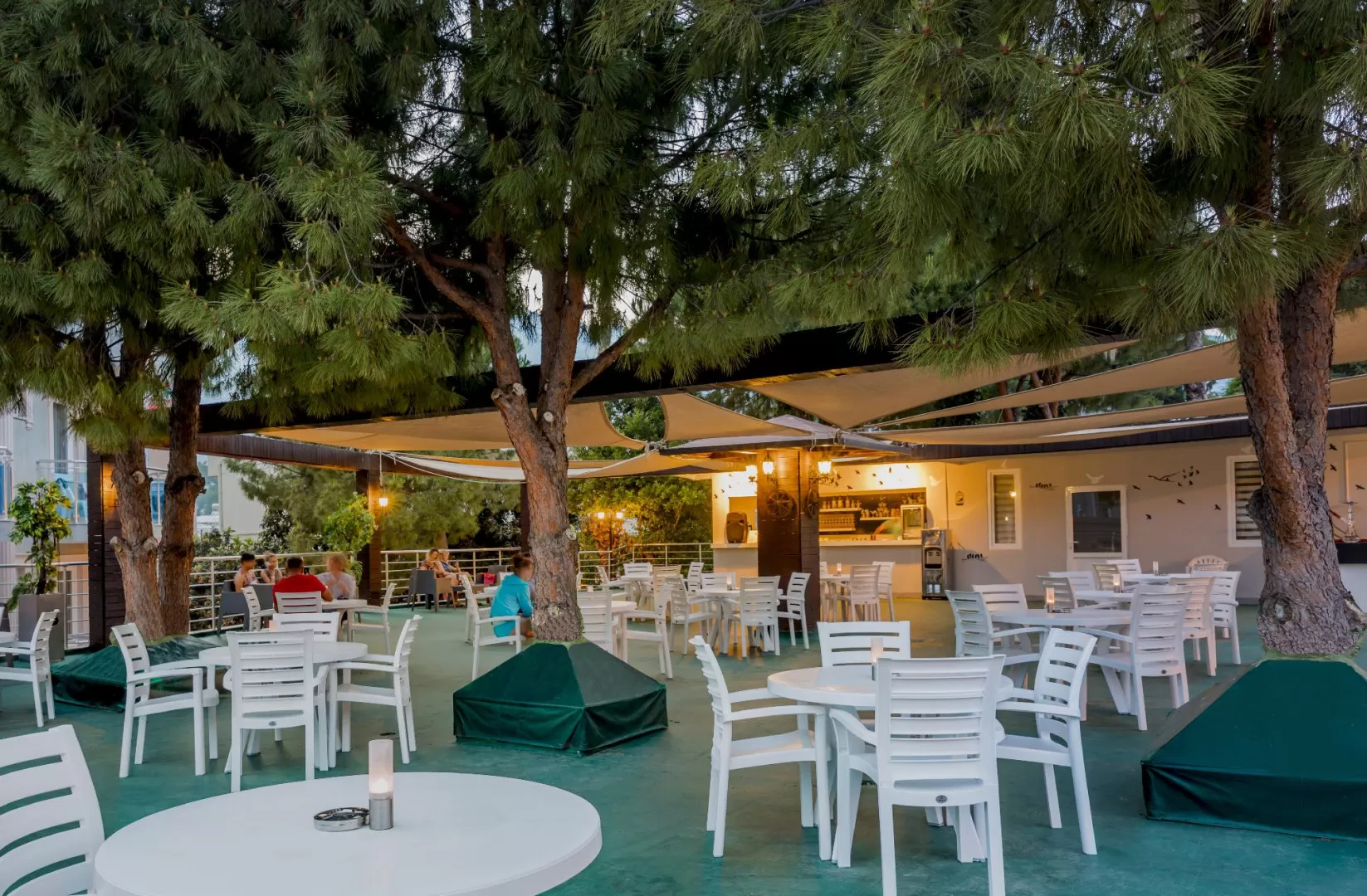 В отеле действует система "Все включено" с 10:00 до 22:00, которая включает алкогольные и безалкогольные напитки местного производства. В баре у бассейна можно заказать напитки с 10:00 до 22:00. Основной ресторан предлагает завтрак (07:30-09:30), обед (12:30-14:00), чай с выпечкой (17:00-17:30) и ужин (19:00-20:30). Свежевыжатый сок, импортные напитки и турецкий кофе предлагаются за дополнительную плату.