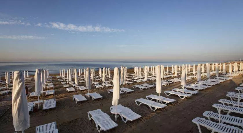 Собственный песчаный пляж, длина - 150 м, ширина - 50 м. Зонтики и шезлонги на берегу моря и у бассейна бесплатные.