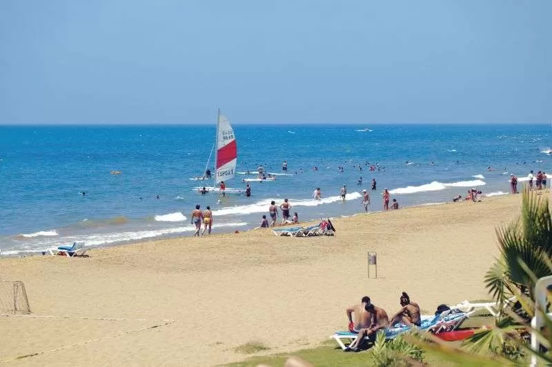 Собственный, песчаный, через дорогу в 250 м от отеля, подземного перехода нет, длина - 900 м. Полотенца, шезлонги, матрасы , зонтики - бесплатно. Вход в море - песчаный, пологий. Автобуса на пляж нет.