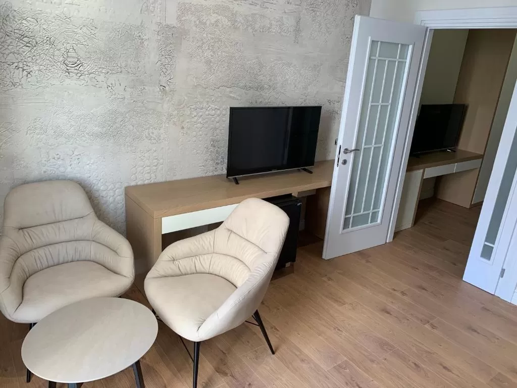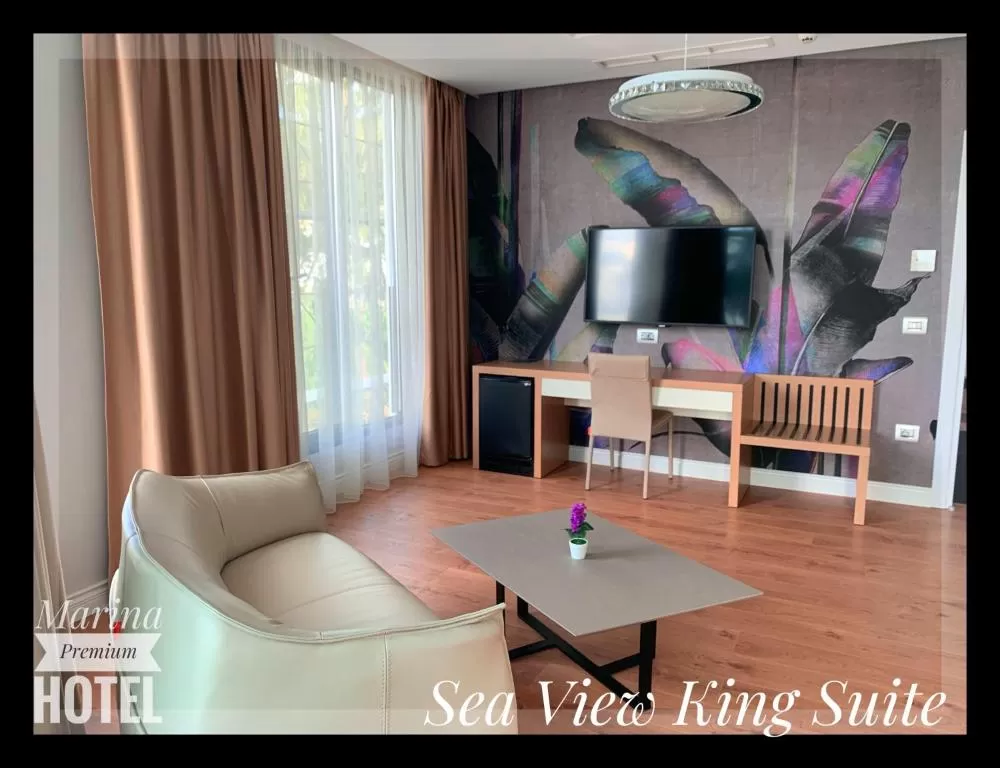 King Suite: однокомнатный номер Sea view без балкона, поделен на зону спальни (двуспальная кровать) и зону гостиной. Всего 2 номера в отеле. Третий взрослый может быть размещен на доп.кровати.