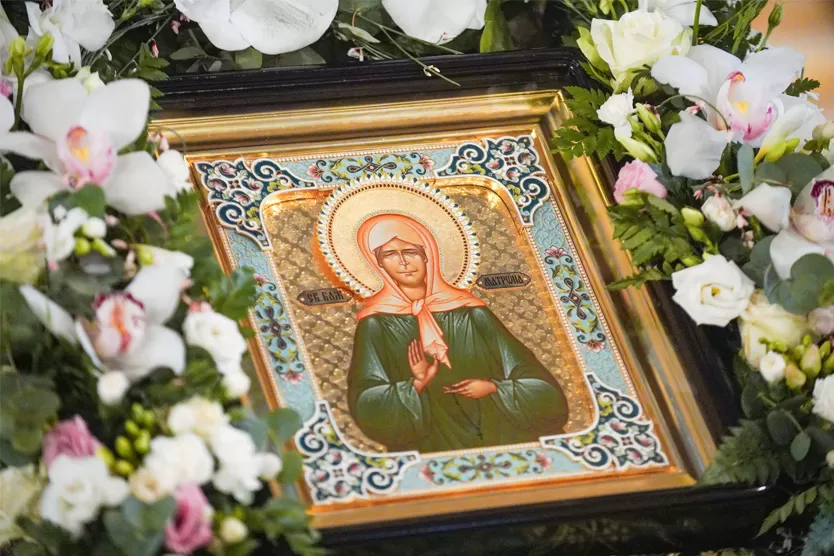 (Матрона Димитриевна Никонова, 1881–1952) — одна из самых почитаемых святых Русской православной церкви, блаженная старица, прославившаяся прижизненными чудесами, даром прозорливости и исцеления. Родилась слепой в Тульской губернии, с детства обладала глубокой верой. С 1925 года жила в Москве, помогая людям молитвой и советом.