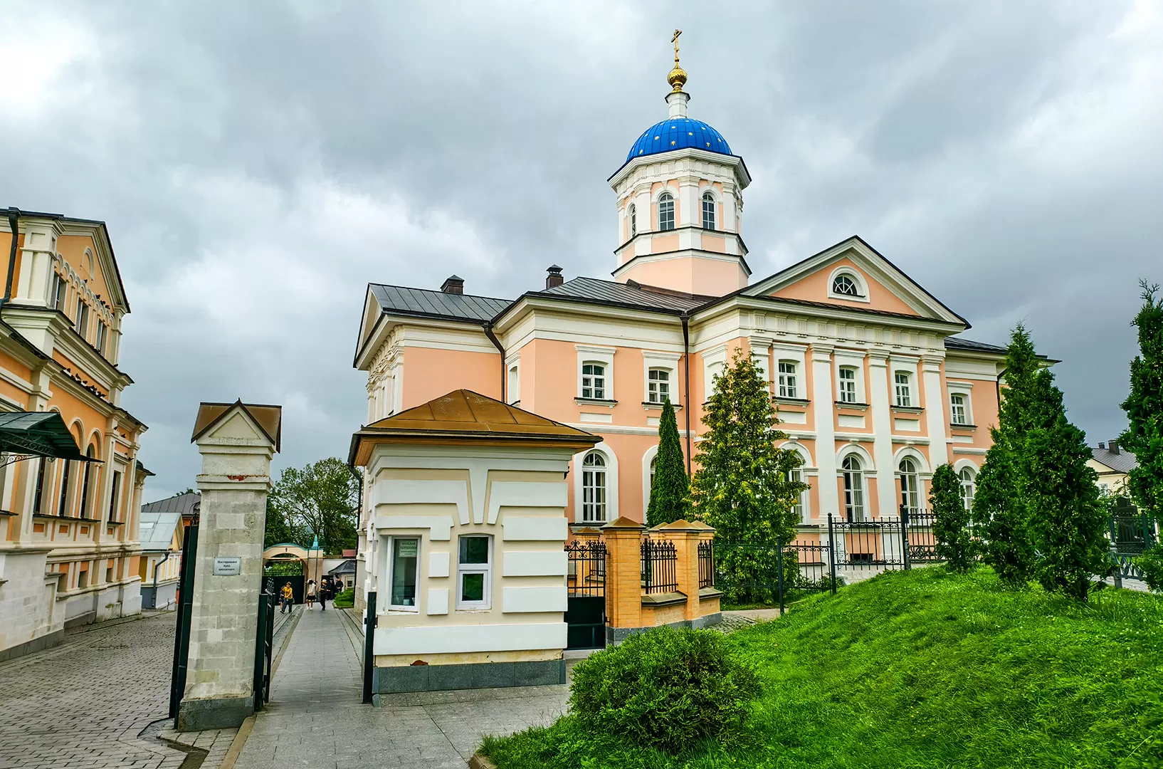 Первоначально это здание было построено как братская трапезная, на средства, завещанные благотворительницей Анной Сергеевной Ртищевой. Постройка была окончена в 1824 году при игумене Данииле. Братская трапезная располагалась на нижнем этаже и в 1827 году была расписана иконной живописью. В 1850-х годах трапезная была перенесена в новый корпус, а в этом здании была устроена церковь в честь преподобной Марии Египетской и св. праведной Анны (матери Пресвятой Богородицы). Храм освящен 8 июня 1858 года епископом Калужским и Боровским Григорием. Под храмом в склепе была похоронена храмоздательница А. С. Ртищева. В 1880-х годах преподобный старец Амвросий по согласию с настоятелем о. Исаакием, на средства благотворителей перестроил храм. Теперь в нем стало два придела. Один — в честь преп. Марии Египетской и св. прав. Анны. Второй — в честь святителя Амвросия Медиоланского и благоверного князя Александра Невского. Святитель Амвросий — святой покровитель старца в монашеском постриге, а благоверный князь Александр — покровитель его во святом крещении. Оба придела храма освящены были Калужским епископом Владимиром 1-го и 2-го декабря 1885 года. После революции храм был закрыт. Сейчас в нем ведутся восстановительные работы. В храме планируется устроить два придела, как это было устроено по благословению старца Амвросия. Часть помещений занимает иконописная мастерская. 20 октября 2011 года состоялось малое освящение правого придела в честь святой праведной Анны, матери Прествятой Богородицы и преподобной Марии Египетской.