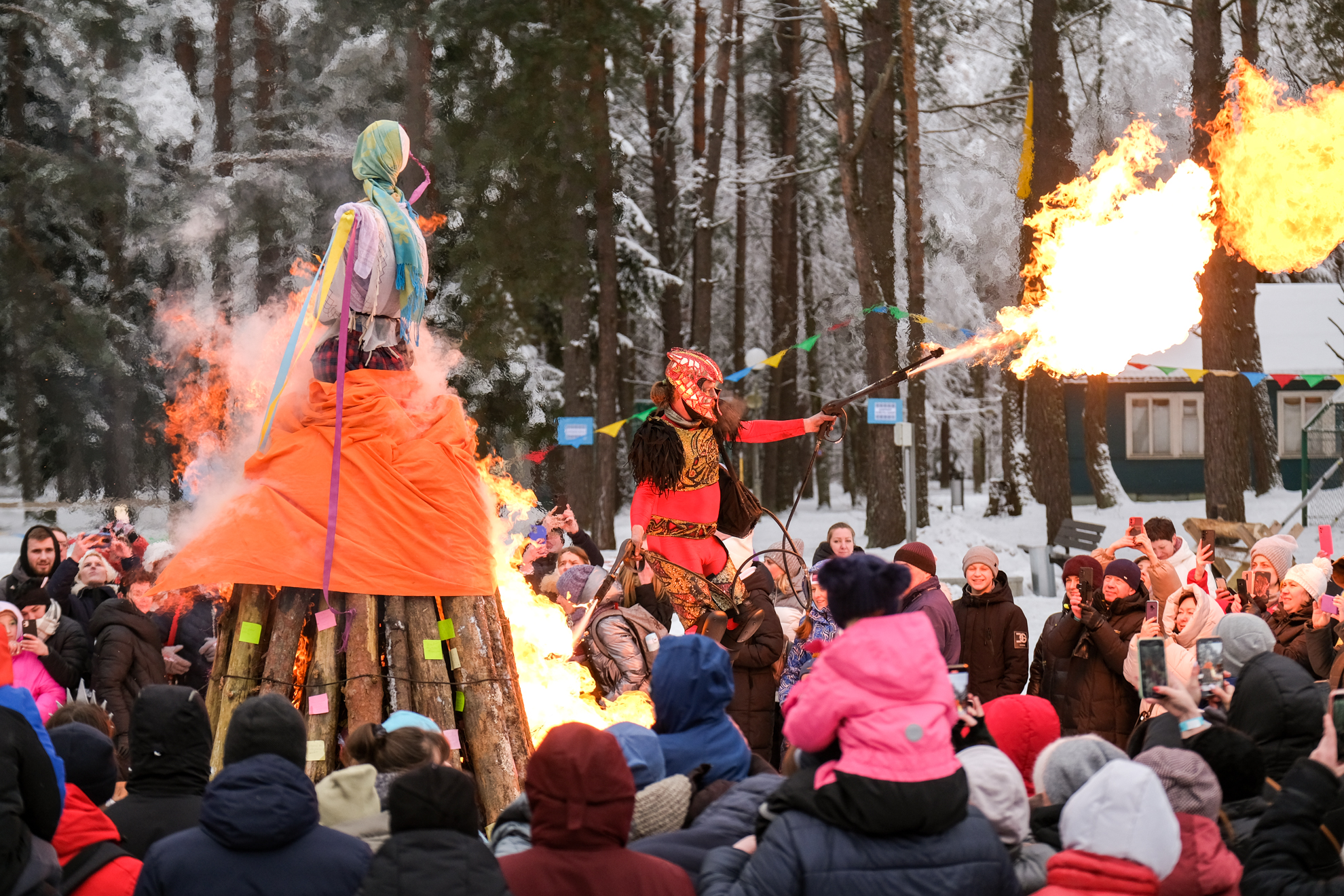 Праздничная встреча у ворот и живая музыка увлечёт в масленичный круговорот: и дуда, и скрипка с барабаном! Вкусное угощение, весёлое настроение, задорная компания, красивая природа - вот что ожидает Вас! Часть программы проходит в теплом помещении, где вы сможете сесть за стол и отведать подаваемое угощение, а наши аниматоры не дадут Вам скучать, увлекая в различные конкурсы и масленичные обряды. Истинное удовольствие - это мастер-классы по народным играм и танцам! Кульминация нашего праздника - весёлые проводы зимы - сжигание соломенного чучела!